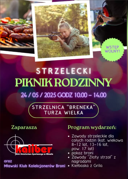 Mamy zaszczyt zaprosić wszystkich członków Klubu Strzelectwa Sportowego "Kaliber" oraz Mławskiego Klubu Kolekcjonerów Broni wraz z Rodzinami i przyjaciółmi na Pierwszy Strzelecki Piknik Rodzinny.
