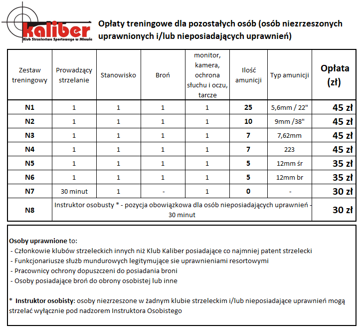 - *15zł - (50% opłaty) za zajęcie stanowiska na 30minut podczas treningu strzeleckiego przez członka Klubu