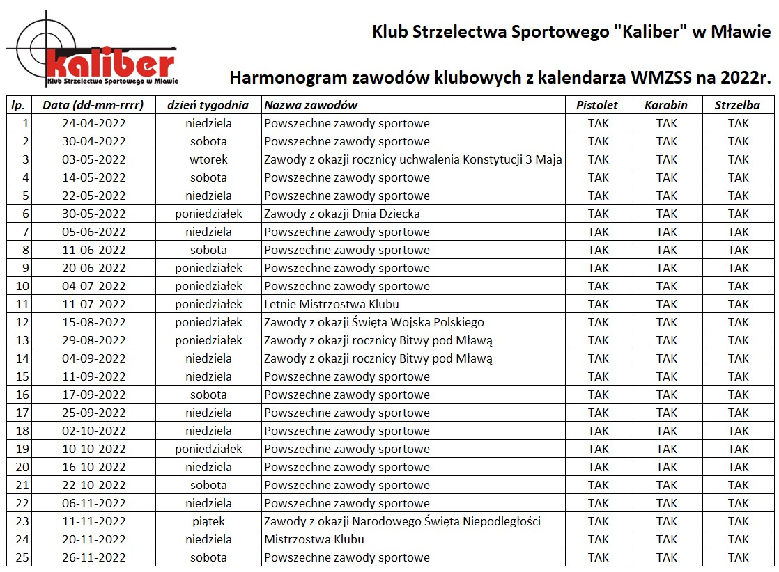 W dziale HARMONOGRAM opublikowaliśmy aktualną listę zawodów klubowych wpisanych do kalendarza Warszawsko-Mazowieckiego Związku Strzelectwa Sportowego na 2024 rok.